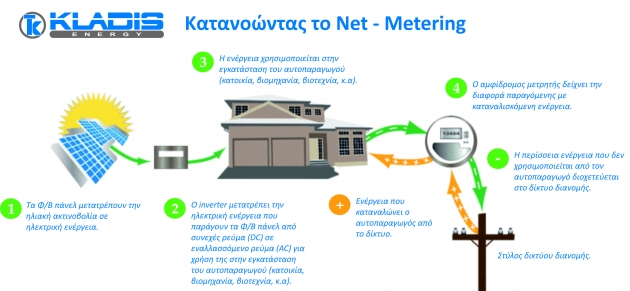 Το Ï€ÏόγÏαμμα Net – Metering επιτÏÎπει την εγκατάσταση φωτοβολταϊκών σταθμών και μικÏών ανεμογεννητÏιών από αυτοπαÏαγωγοÏÏ‚ σε εγκαταστάσεις τους , οι οποίες συνδÎονται με το δίκτυο. Η ενÎÏγεια που παÏάγεται από τον σταθμό στÎλνεται στο δίκτυο διανομής και συμψηφίζεται σε κάθε κÏκλο καταμÎÏ„Ïησης με αυτή την οποία αποÏÏόφησε από το δίκτυο ο αυτοπαÏαγωγός. Αν από τον αυτοπαÏαγωγό Îχει παÏαχθεί πεÏισσότεÏη ενÎÏγεια από αυτήν που καταναλώθηκε, αυτή η διαφοÏά δεν χάνεται αλλά πιστώνεται για συγκεκÏιμÎνη χÏονική πεÏίοδο, ενώ στην αντίθετη πεÏίπτωση που ο αυτοπαÏαγωγός Îχει καταναλώσει πεÏισσότεÏη ενÎÏγεια από αυτή που Îχει παÏαχθεί , χÏεώνεται μόνο την διαφοÏά ανάμεσα στην παÏαγόμενη και καταναλισκόμενη ενÎÏγεια. Έχοντας σαν παÏάμετÏο ότι οι πεÏισσότεÏοι μετÏητÎÏ‚ είναι αμφίδÏομοι, το κόστος για την εφαÏμογή του Net – Metering μειώνεται σημαντικά, Î±Ï†Î¿Ï Î´ÎµÎ½ χÏειάζεται η εγκατάσταση δεÏτεÏου μετÏητή.