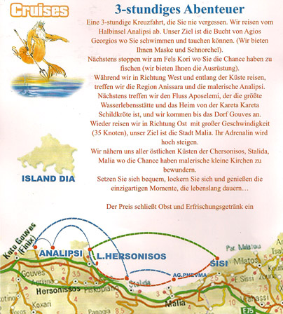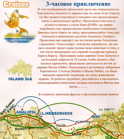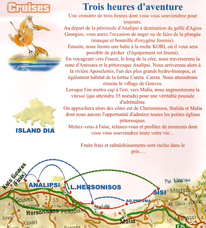 Μια τρίωρη κρουαζιέρα που θα σας μείνει αξέχαστη.Ξεκινάμε από την Aνάληψη Xερσονήσου και κατευθυνόμαστε προς τον Άγιο Γεώργιο που μπορείτε να κολυμπήσετε και να ζήσετε μοναδικές εμπειρίες παρατηρώντας το βυθό. (θα σας παρέχουμε εμείς τον απαραίτητο εξοπλισμό).